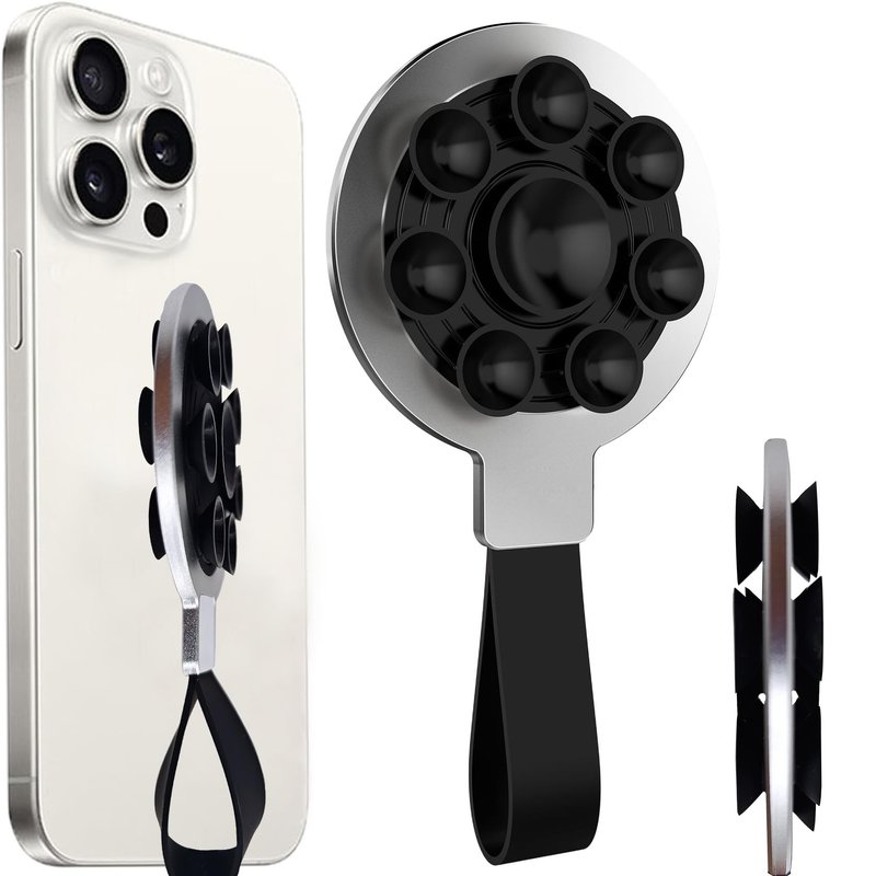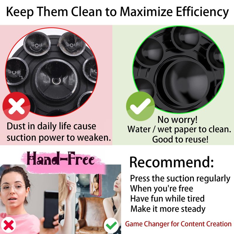 - Great for Content Creation: Both sides have 1 suction with diameter 0.74 inch and 7 suctions with diameter 0.51 inch for steady, hands-free photo, video or selfies -for iPhone, Android, Samsung and more. Allowing you to effortlessly adhere the phone to mirror, window, and various smooth, flat, clean surface (Not for textured / print). When you're feeling tired from work or study, pressing the suction cup to have fun and apply more pressure to make it steady since it is not attached permanently