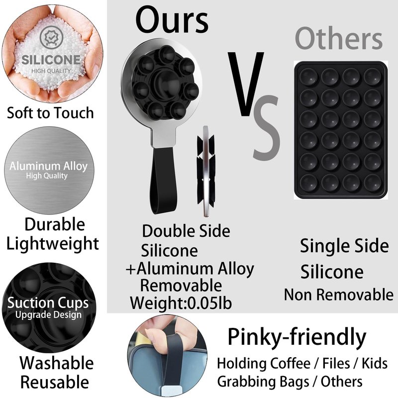 - Safe Material & Upgrade Design: Quality soft silicone material, making the phone grip small size but with big suction to match a variety of mobile phone models. Also it is comfortable for your pinky to hold the strap. The metal part of the quality aluminum alloy is durable and safety. The design of this phone grip is from our excellent designers listening to the feedback of thousands of users. Easily switch between devices or go mount free, perfect for content creators who value convenience