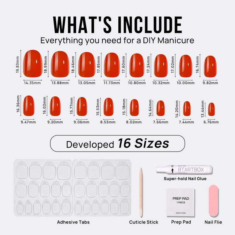 What's Included:16 nail sizes ensure a totally custom fit, plus we give you everything needed just in case! Each set comes complete with a storage box, nail glue, adhesive tabs, double-sided nail file, cuticle stick, and prep pad.