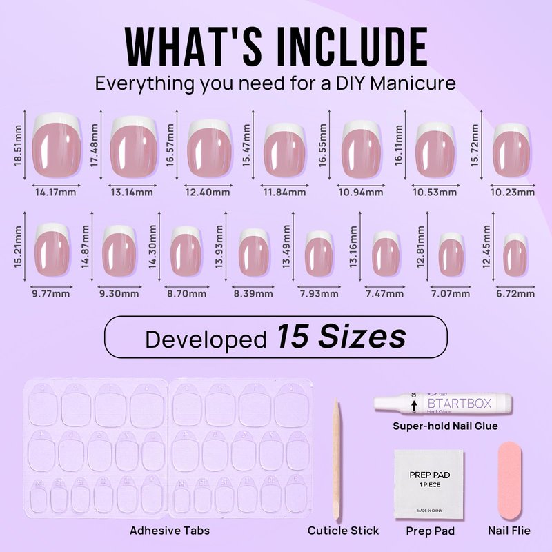 - What's Include: 15 nail sizes ensure a totally custom fit, plus we give you everything needed just in case! Each set comes complete with a storage box, nail glue, adhesive tabs, double-sided nail file, cuticle stick, and prep pad.