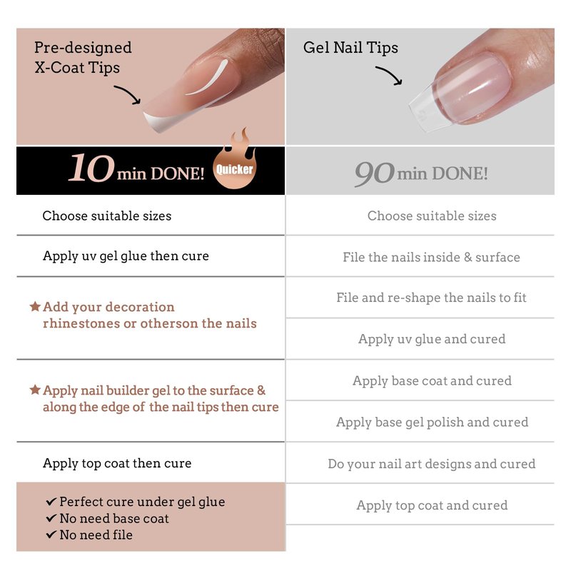 - 3 IN 1 XCOATTIPS with Base Coat and Tip Primer Coverd: With newest technology, our XCOATTIPS are well combined with soft gel tips and pre-applied base coat and tip primer. It makes both the bottom and top are pre-etched,letting your nails last for 28 days+ by removing nail grease in advance for maximum adhesion between glue and nail beds