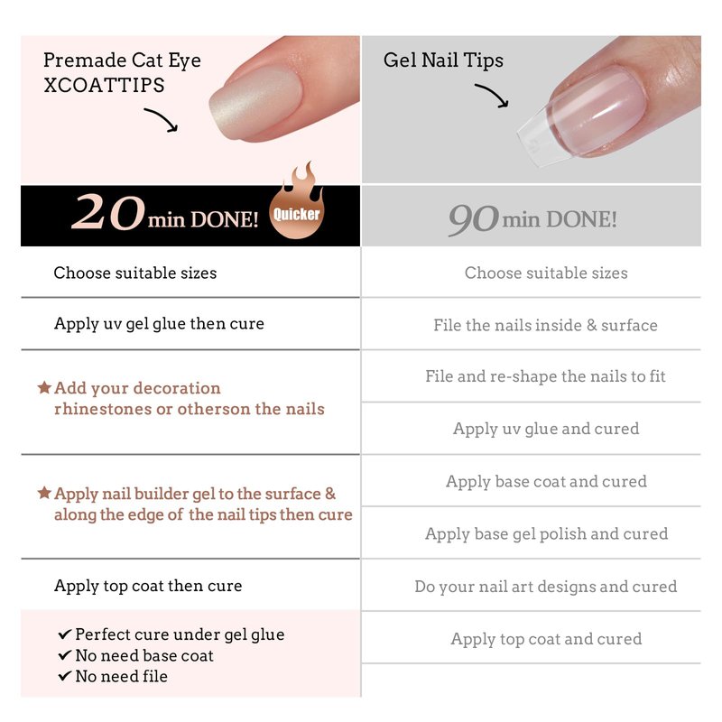 - PATENTED X-COATTM PROCESS: Proprietary technology for these short square nail tips allowing ultraviolet rays through tips and curing the gel glue or solid gel glue, even after the ombre/French/gradient/cat eye design process.