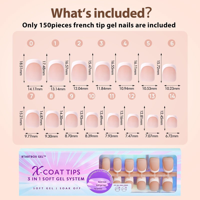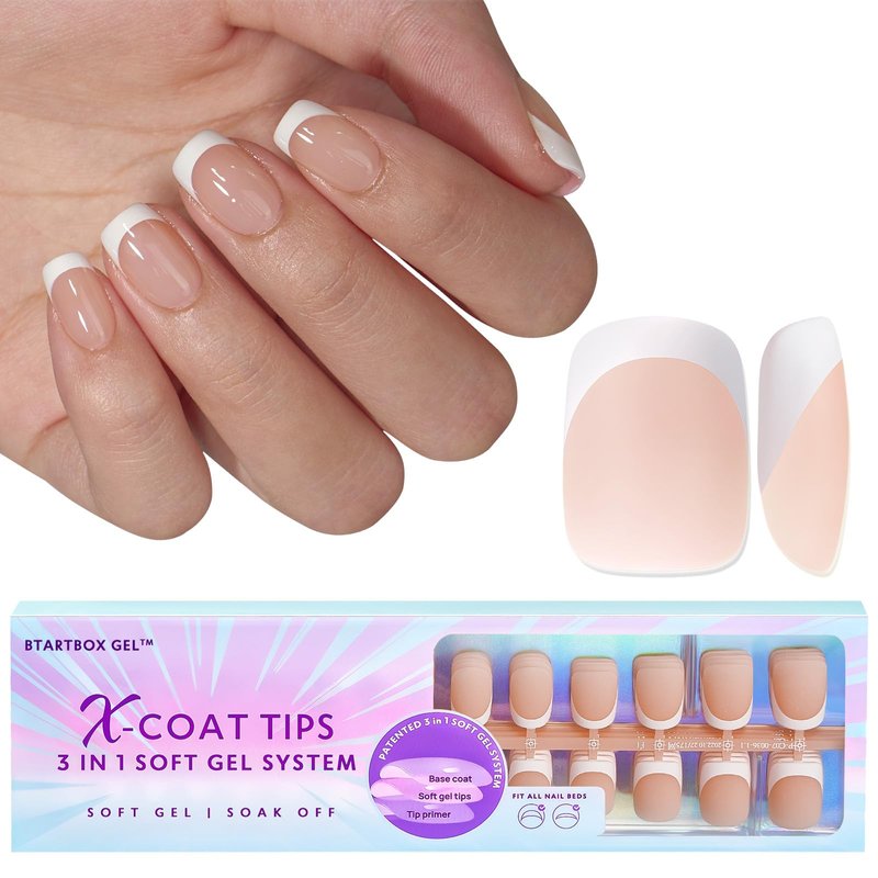 - 【PATENTED 3 IN 1 NEUTRAL XCOAT GEL TIPS WITH TIP PRIMER & BASE COAT】With the patented technology, BTArtboxnails french tip gel nails are pre-applied a tip primer cover and a base coat cover on the soft gel nail tips, which makes the nail tips surface a coarser matte and more effectively remove the nail grease in advance, so that the nails are stronger adhesion with glue and not easy to fall off.