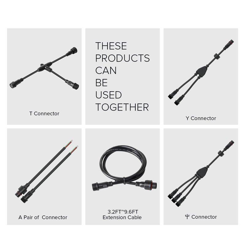 - Mating Extension cord connectors: Search this ASIN on amazon B0899XC541 there are 3.2ft 6.4ft 9.6ft extension cable connectors. The length of the wire can be increased, thus making it more versatile. Search this ASIN on amazon B07ZZ7JVKP ,it is Tee connector for 2 PIN Big size connector T shape. 1 TO 2 Splitter Y connector:B08R8XGL9V . 1 TO 3 Splitter 屮 connector:B08R8X6Q2N