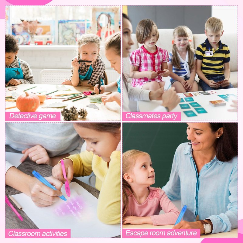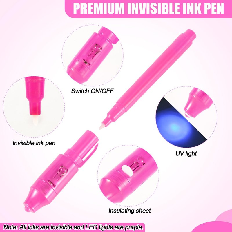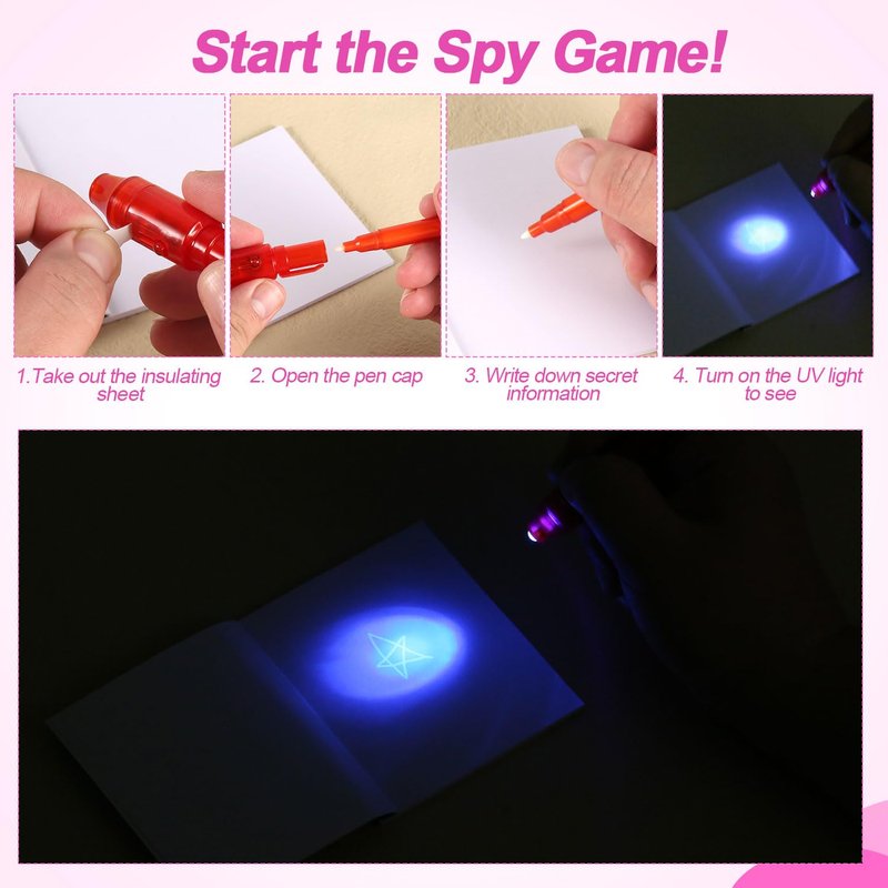 - Funny Game: Kids can write down their secrets or other information on the notebook with an invisible ink pen. The magic ink will hide the secrets because the information will only be revealed when the LED light on the pen cap turns on. Use the magnifying glass to avoid missing any clues.