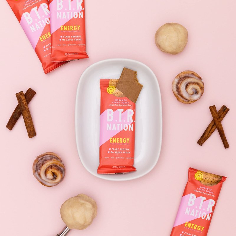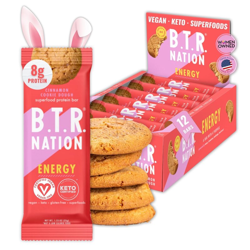 B.T.R. Bar Cinnamon Cookie Dough ENERGY Bars are vegan, keto & paleo protein bars boosted with 7+ superfoods & adaptogens for energy. Powered by plants, gluten-free, dairy-free, and soy-free with no added sugar, no sugar alcohols, no stevia, no junk ever, this perfect bar makes the best healthy snack for the whole family. Registered Dietitian approved to make you feel extra good about every delicious bite!