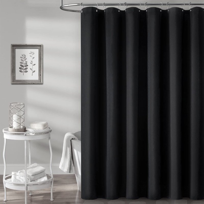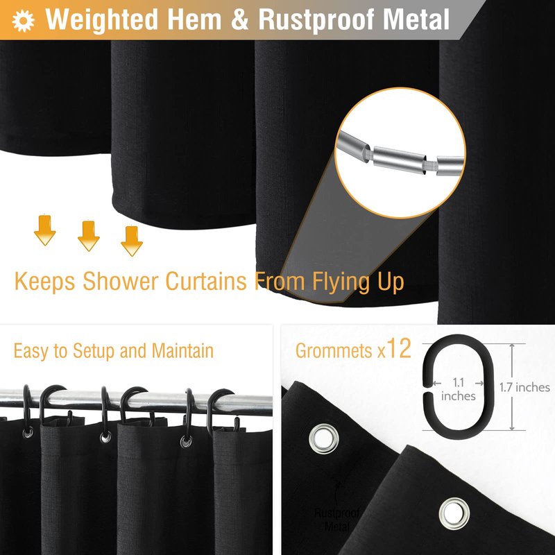 - 🛁【Extra Long Size】- W72’’×H84’’/(182cmx214cm). 12 rust-proof metal grommets (to prevent tears) that fit most standard shower hooks or rings. Package includes 1 Black Shower Curtain and 12 Plastic Hooks(Convenient to install)