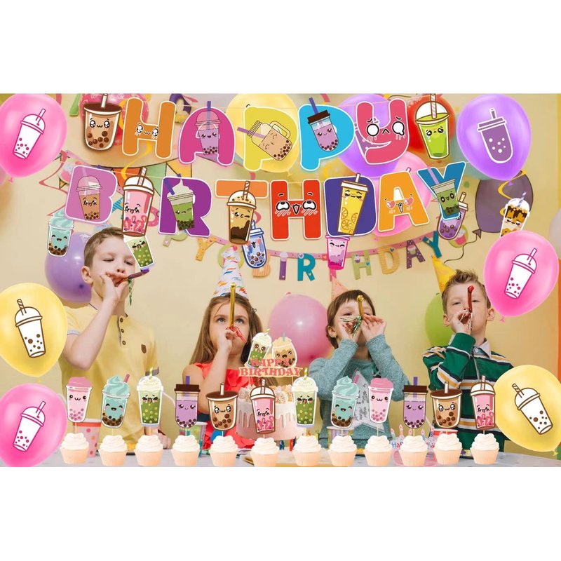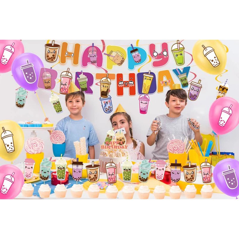 - Boba Tea Party Decorations: Package includes 1* boba tea theme HAPPY BIRTHDAY banner, 1*boba tea theme HAPPY BIRTHDAY cake topper, 6* boba tea spirals, 12* boba tea cupcake toppers, 18* boba tea balloons