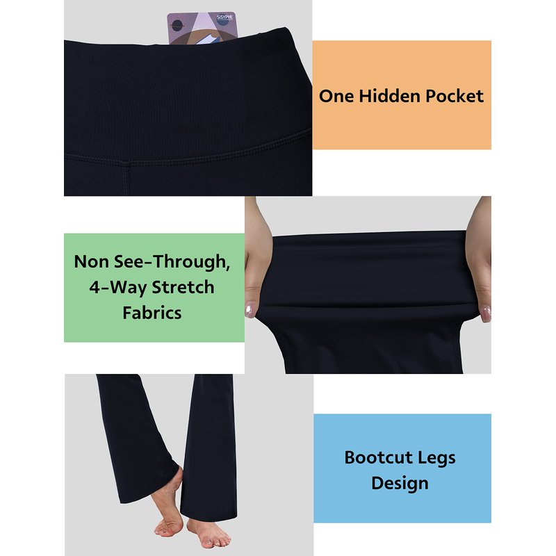 - Design: high waist bootlegs yoga pants provide tummy control. These high waist bootleg yoga pants contours your curves and show off your pefect figure. Inner pocket in waistband to stash your keys and cards. The advanced weaving technology of women's bootcut yoga pants make sweat absorption and drying capabilities stronger, allows you to keep dry even after long time and high intensity fitness. The unique flat lock stitch and compression technology improve blood circulation.