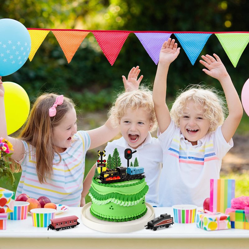 - Packaging Includes: you will get 4 small toy trains, 5 tree cake toppers, 2 small curved rails, 2 signal lights, which look vivid and cute, and easily attract children and adults