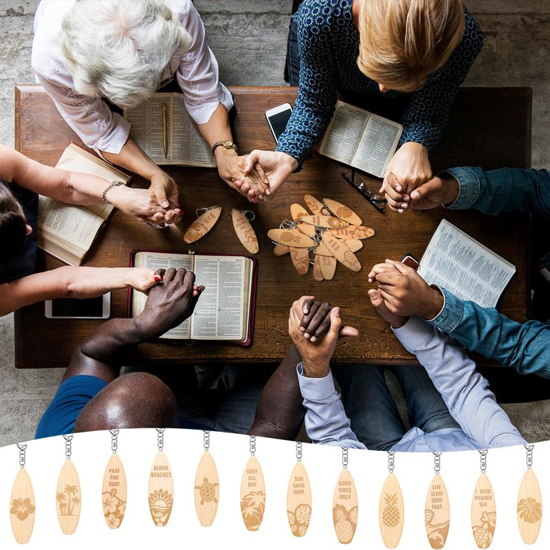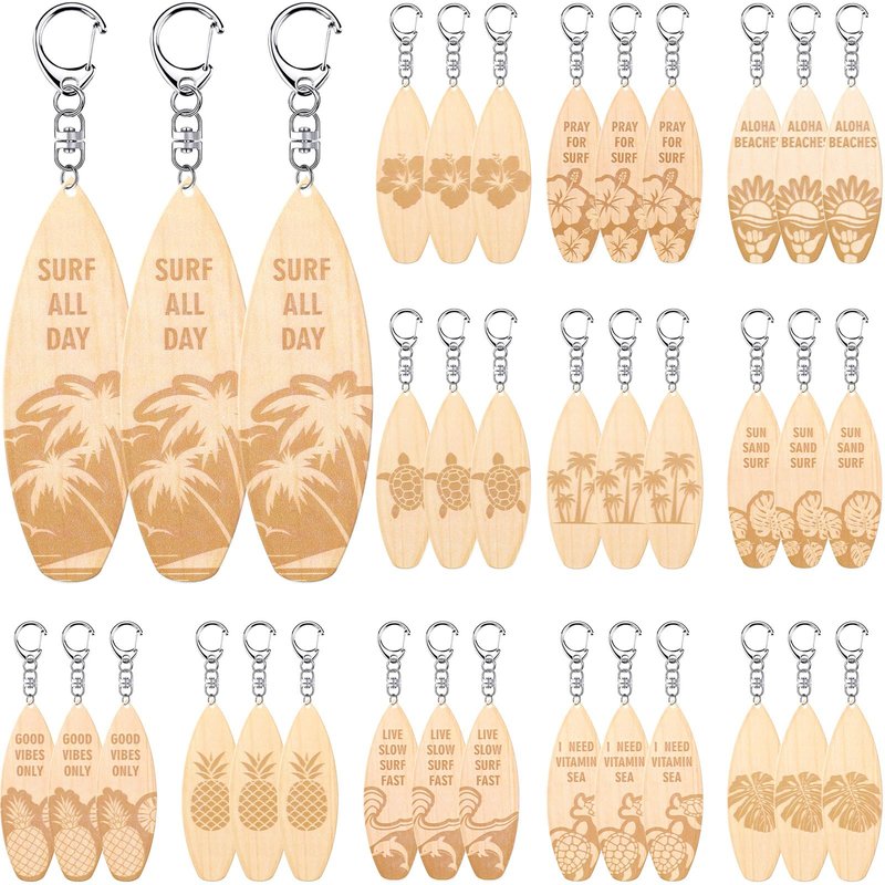 - Mini Surfboard Keychain Package Include: a set of 36 surfboard keychains in 12 designs in the form of miniature surfboards in wood colors, these surfboard keychains have a Hawaiian feeling in fresh colors