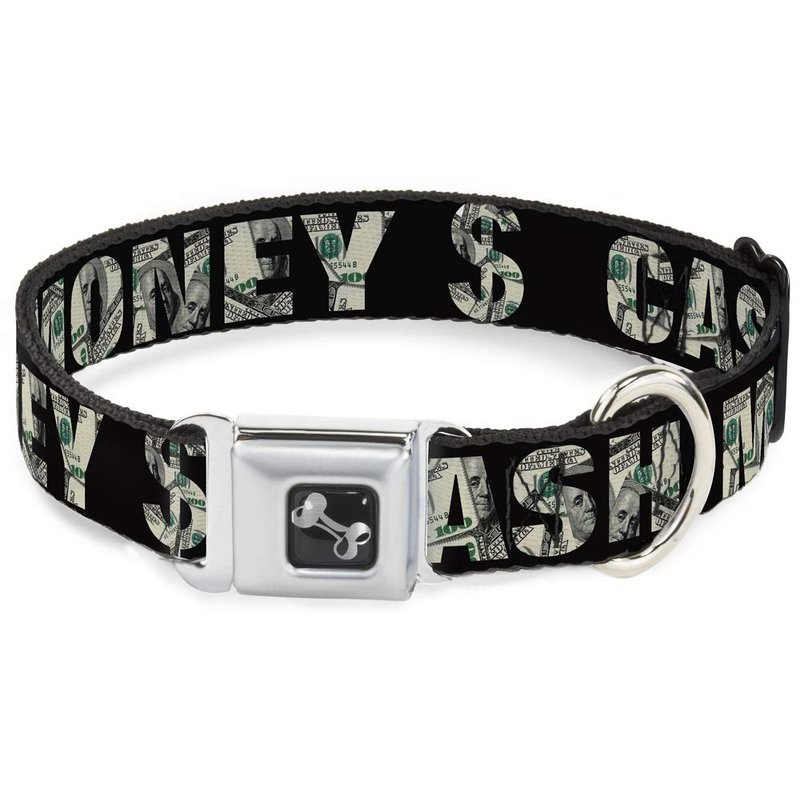 - Style: Buckle-Down Seatbelt Buckle Dog Collar - CASH MONEY $ Black/Dollars - 1.5" Wide - Fits 16-23" Neck - Medium