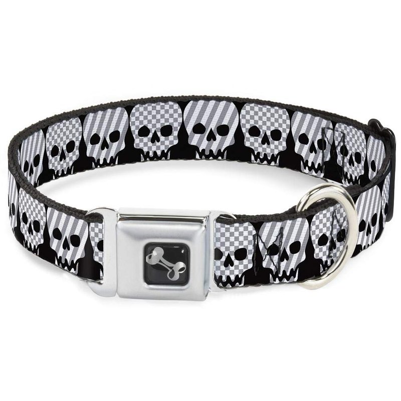 - Style: Buckle-Down Seatbelt Buckle Dog Collar - Checker & Stripe Skulls Black/White/Gray - 1" Wide - Fits 11-17" Neck - Medium