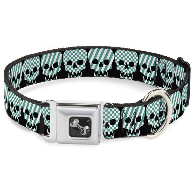 - Style: Buckle-Down Seatbelt Buckle Dog Collar - Checker & Stripe Skulls Black/White/Green - 1" Wide - Fits 11-17" Neck - Medium