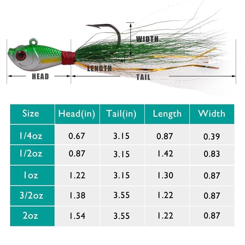 - WEIGHT:5 colors and 5 weights to catch any saltwater species,0.25oz 0.5oz 1oz 1.5oz 2oz (5pcs per pack)