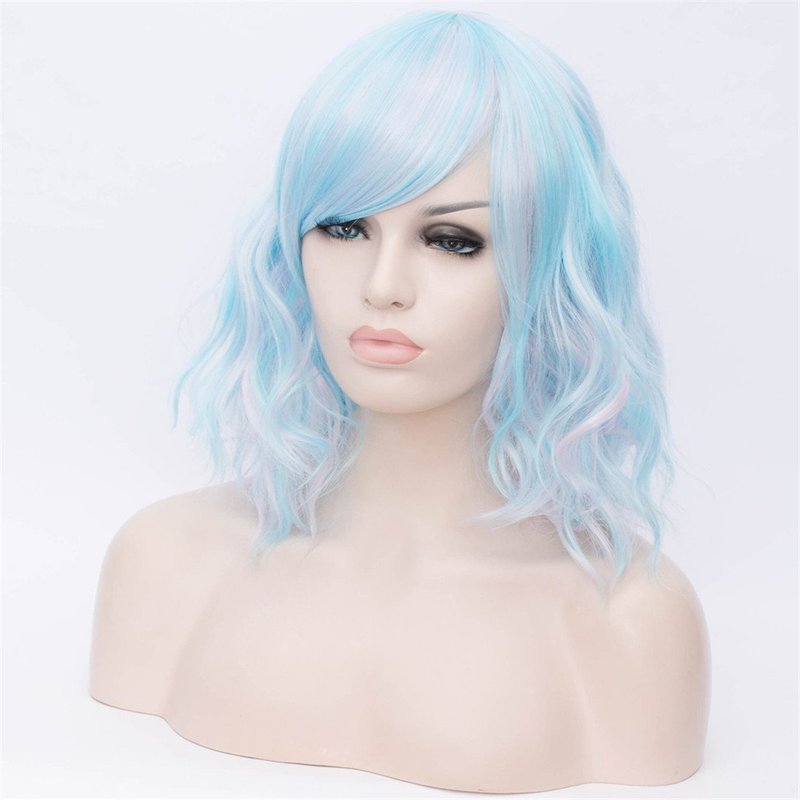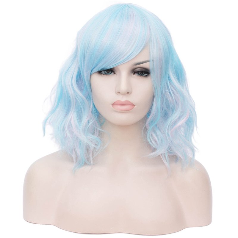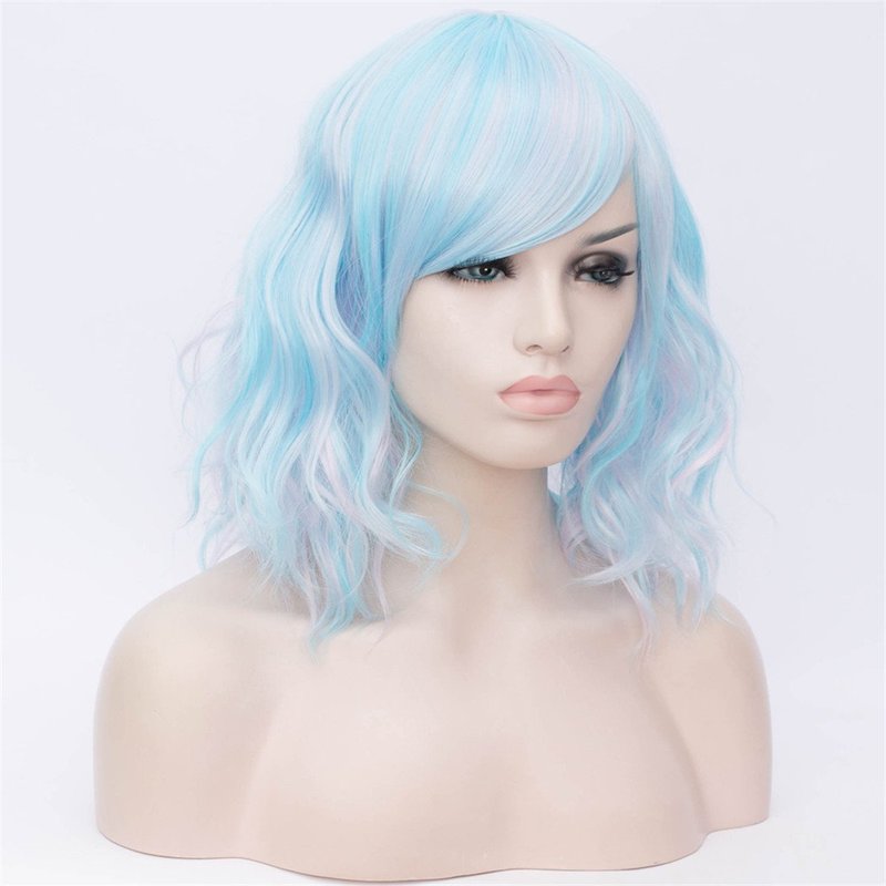 BUFASHION 14" Women Short Wavy Curly Wig Mixed Blue Bob Wig Cosplay Halloween Synthetic Wigs with Side Bang wig(Mixed Blue)