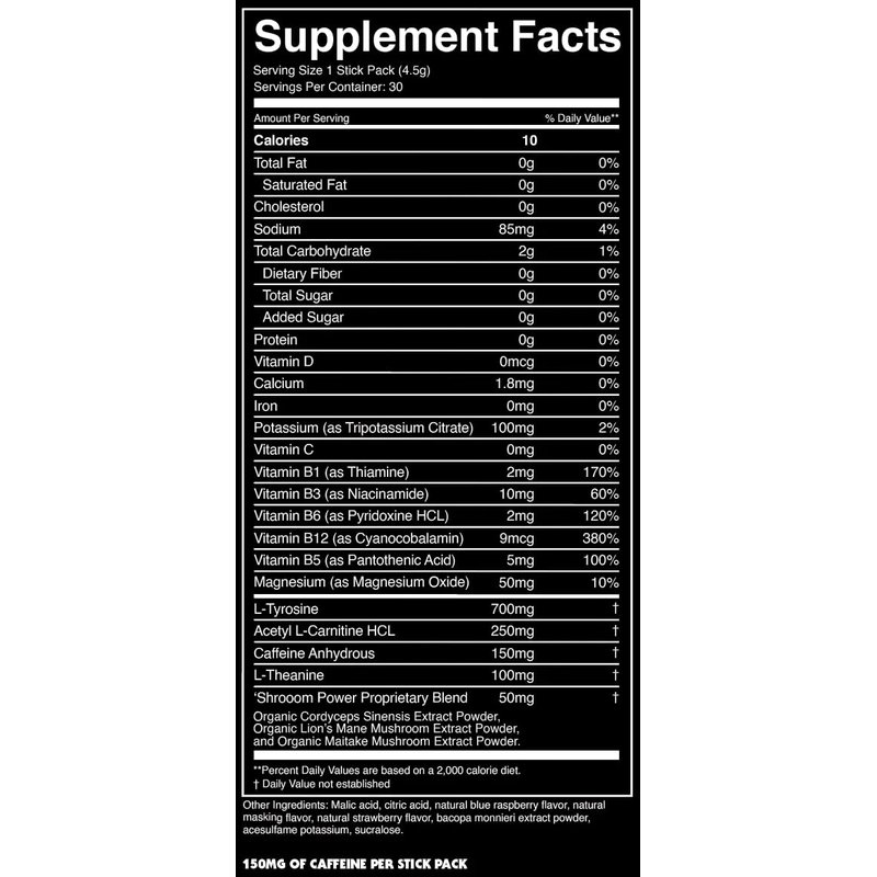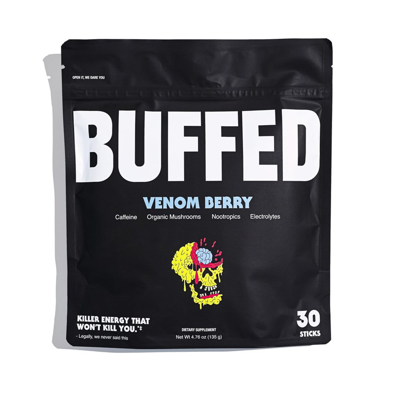 BUFFED Energy Powder Stick Packs, Drink Mix | Clean, Healthy Boost Packets | 150mg Caffeine + Hydration | Nootropics, Organic Mushrooms, B-Vitamins, Electrolytes | 30 Pack-Venom Berry