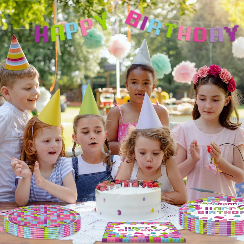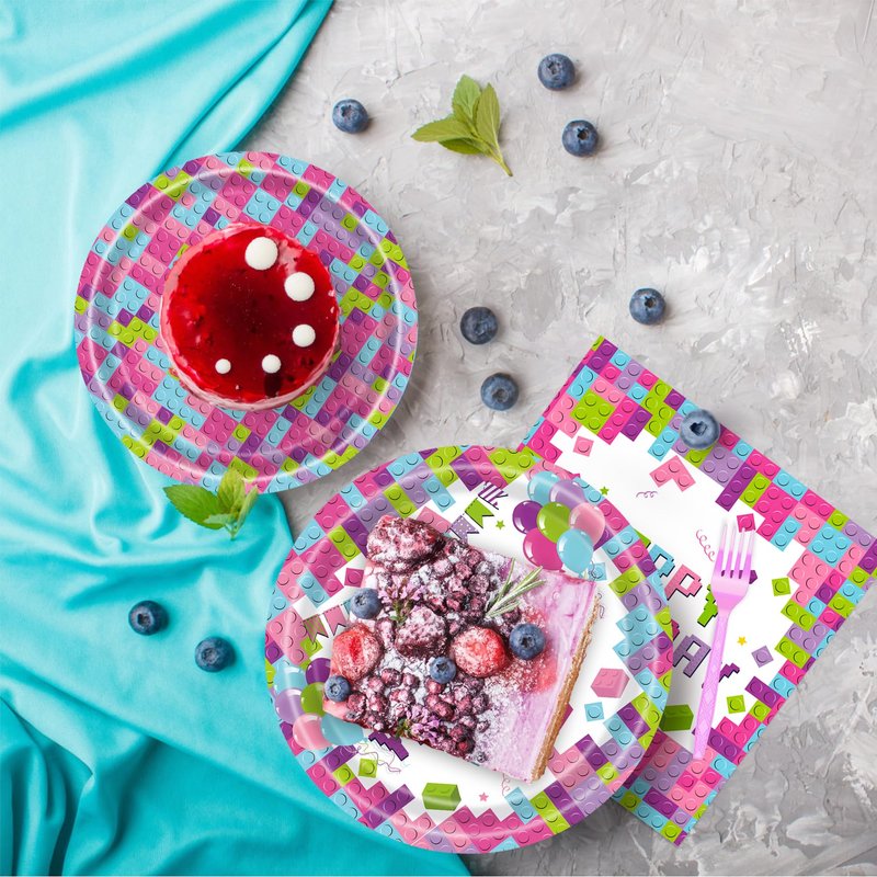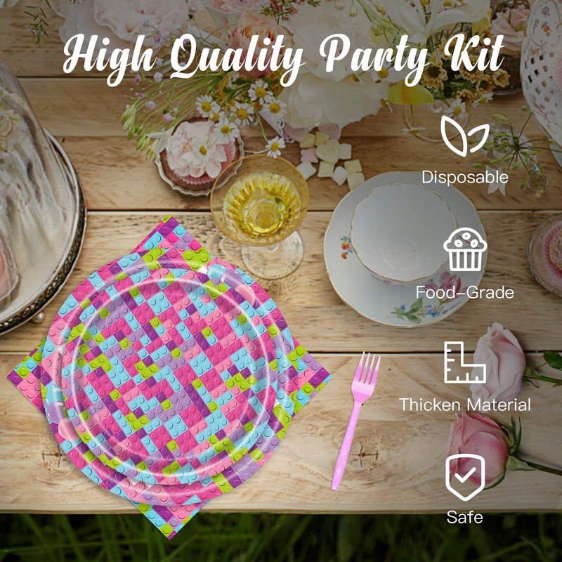 Building Block Party Supplies Kit for 24 Guests - 97 Pcs Including Plates, Forks, Napkins, Bunting - Ideal for Kids' Building Block-Themed Birthdays and Baby Showers