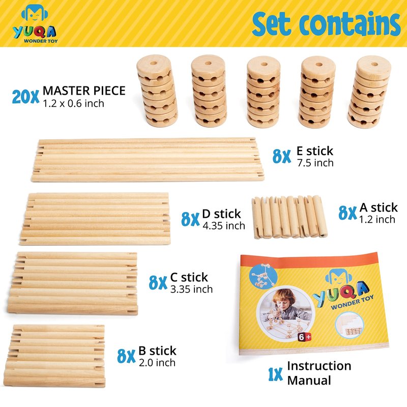 - What's Included: A wonderful 60 piece wooden building block set, allowing children to be creative while encouraging fine motor skills; This bulk pack includes 20 round masterpieces (1.2 inch-diameter and 0.6 inch-height), 8 pieces A stick (1.2 inches), 8 pieces B stick (2.0 inch), 8 pieces C stick (3.35 inch), 8 pieces D stick (4.35 inch), 8 pieces E stick (7.5 inches) and 1 instruction manual;