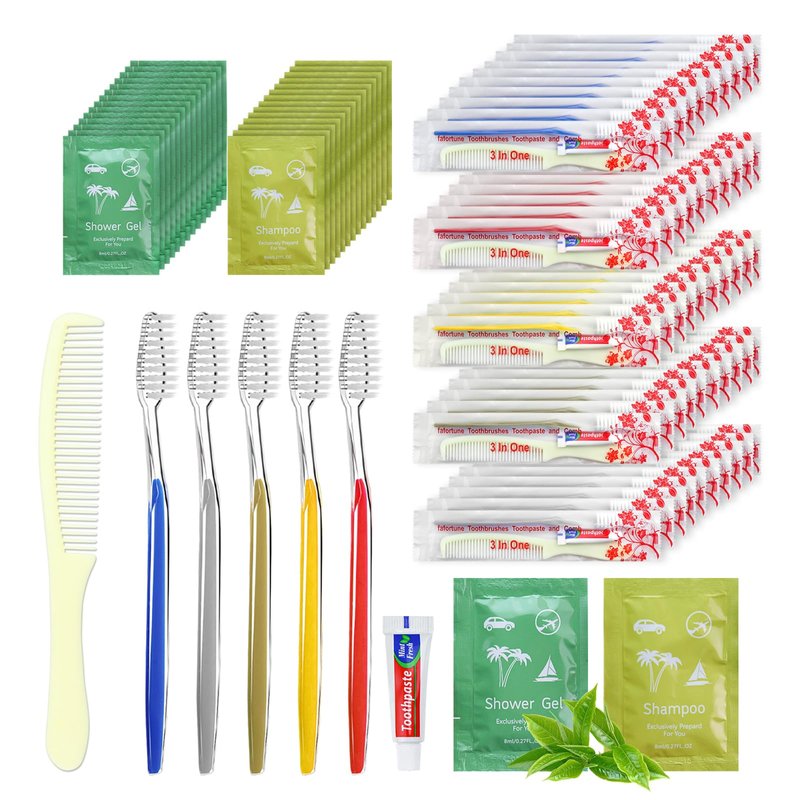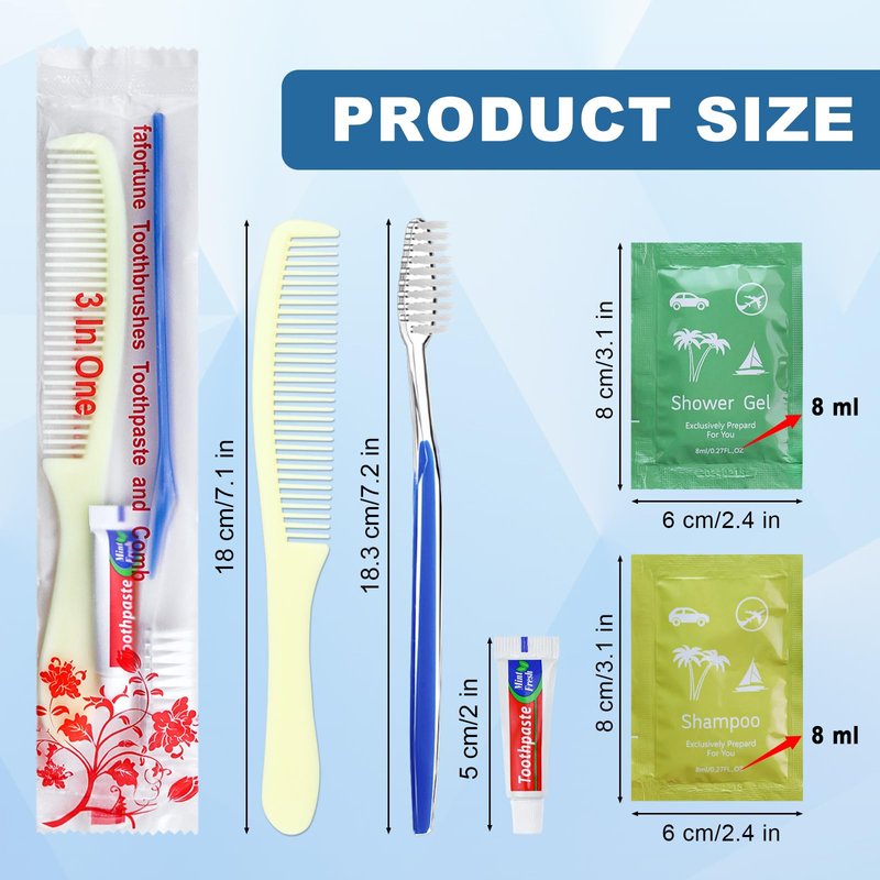 - 2.Good donation choices: toothbrush medium individual, disposable combs, and toothpaste mini sets are individually wrapped for easy carrying and transportation and can be given as gifts to those in need. Shampoo and shower gel are designed in packets with a capacity of 8ml for easy transportation and distribution .These Sets help them maintain oral hygiene and health, improving their quality of life.