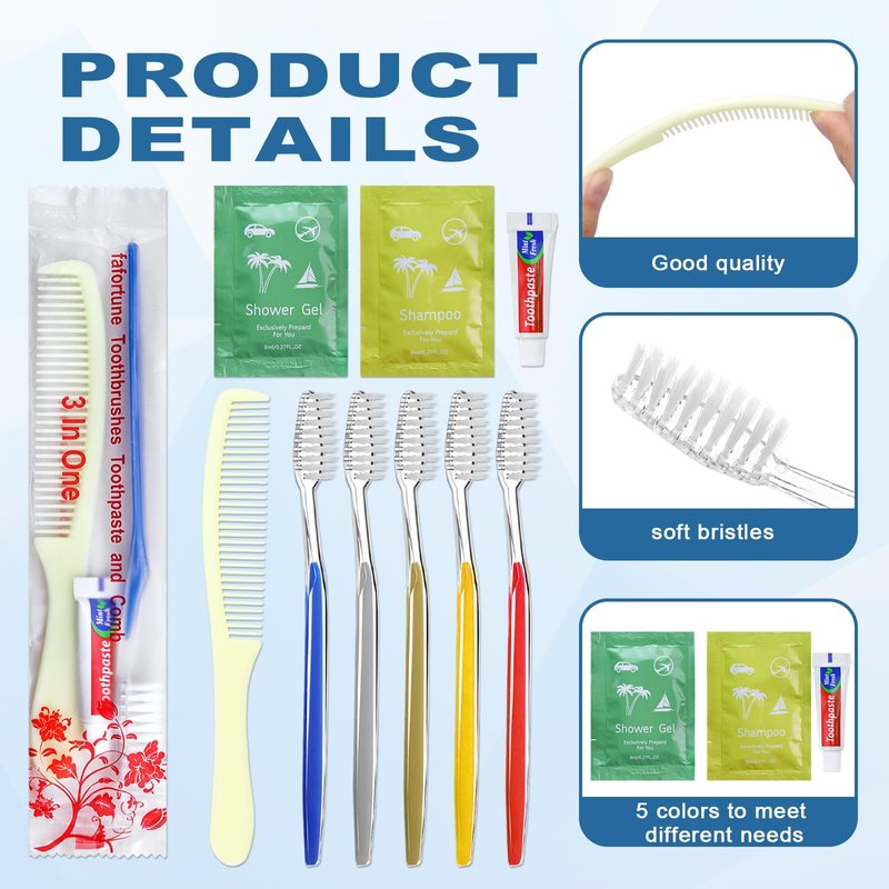 - 5.Individually wrapped: toothbrush kit individually wrapped with toothpaste and combs. Includes a bag of shampoo, a bag of shower gel.