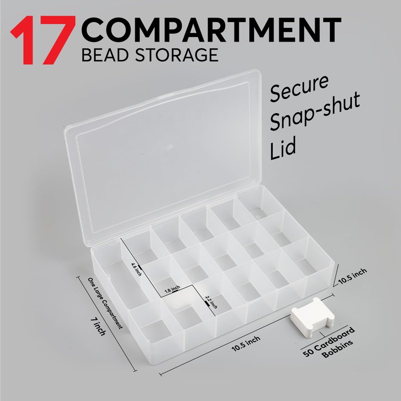 - 17-COMPARTMENT BEAD STORAGE – Keep all your beading essentials in one place with this Clear Bead Organizer Box. The 17 compartments are all the same size 2.5” x 2” x 1.75”, expect for one larger compartment 5” x 2” x 1.75”.
