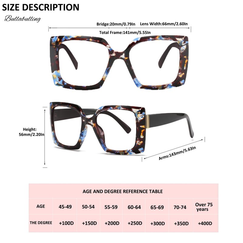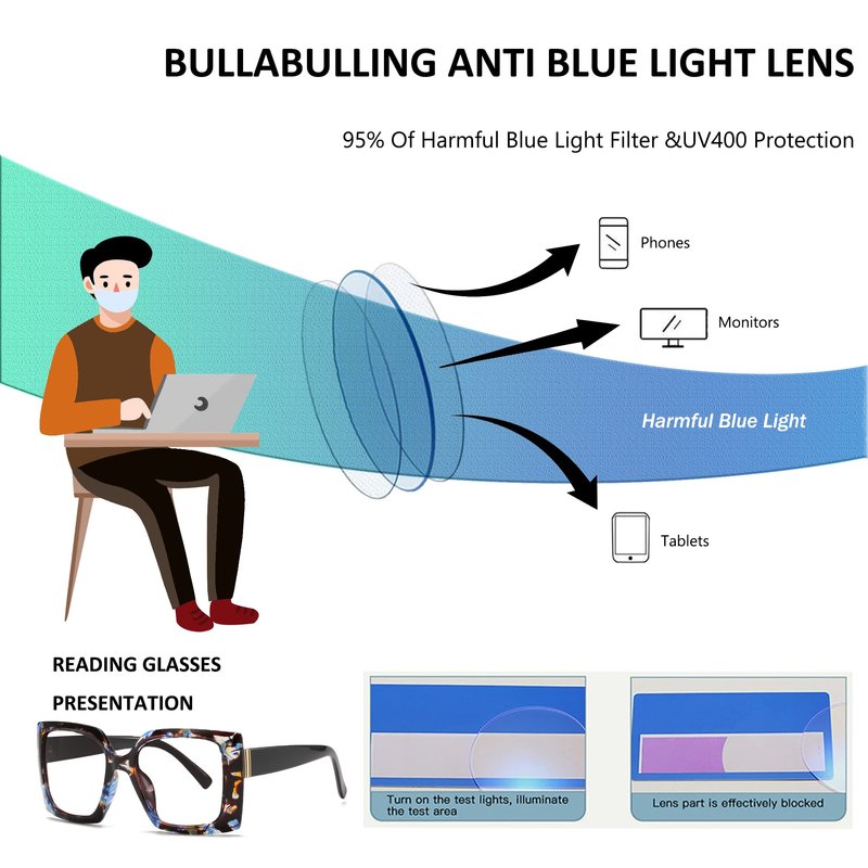 Product instruction: WHY CHOOSE Bullabulling Retro Blue Light Blocking Reading Glasses? →Oversized stylish reading glasses you have never seen →Using the sturdy frame and lenses → Blue light from our computers, phones, tablets and other electronic products causes our eyes to not only work harder but puts them at risk of aging faster. Bullabulling glasses are specially designed to filter out harmful blue light.