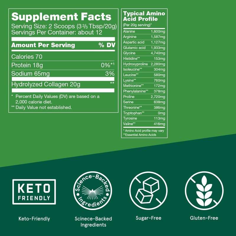 - Every serving of Collagen Peptides has 20g of collagen, no added sugar and mixes easily into hot or cold water; add to coffee, smoothies, soups and more
