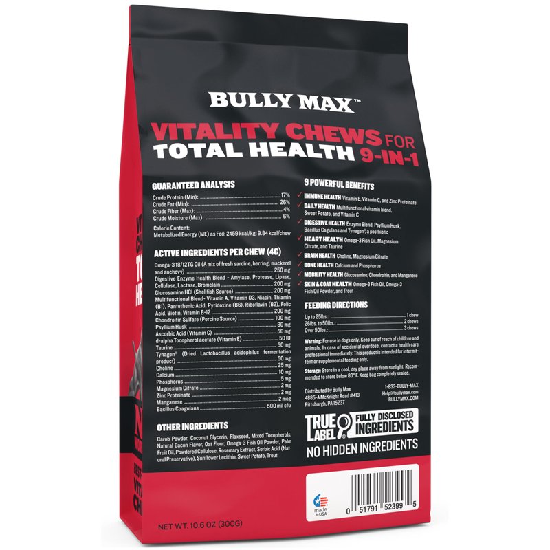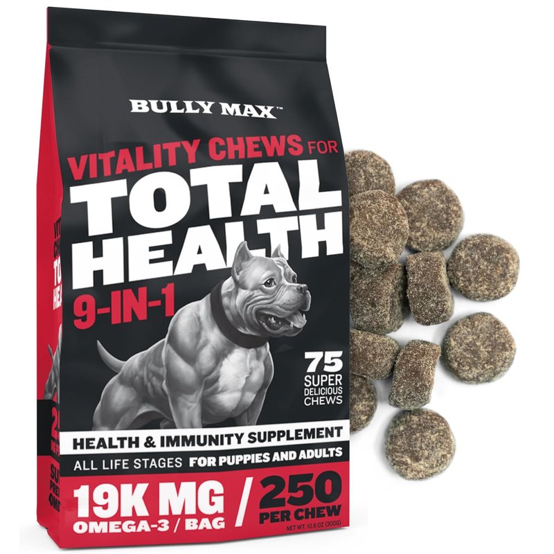 - COMPREHENSIVE 9-IN-1 DOG HEALTH BOOSTER: Experience the multifaceted benefits of Bully Max Total Health Chews. These 9-in-1 dog vitamins and supplements enhance immunity, brain function, bone and mobility health, digestion, heart function, and skin and coat condition. Infused with essential nutrients, vitamins, and minerals, they're the ideal addition to your dog's diet for overall health and vitality. Suitable for dogs of all ages and breeds, these chews are a must-have for every pet owner.