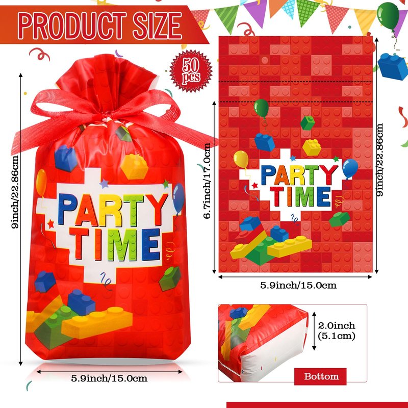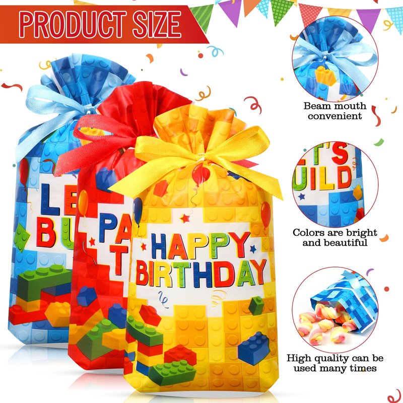 - Building Bricks Design: these building block bags are 3 designs; All bricks candy bags are designed with drawstrings, saving time and convenience, you just need to put the gift into the bricks goodie bag, pull the drawstring and tie it tightly, no need to prepare extra rope and tape