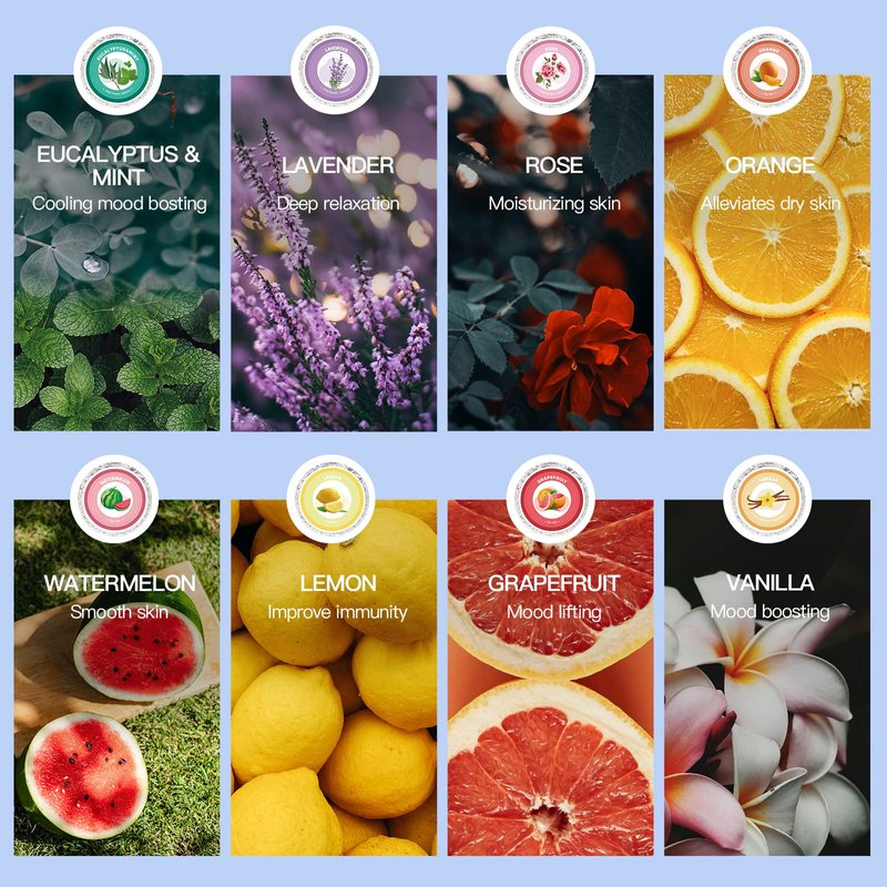 - Eight Magic Scent: Set of 8 packs, includes eucalyptus and mint, lavender, vanilla, rose, grapefruit, orange, lemon, watermelon. Shower steamers don't need for a bathtub, you can still enjoy the fun of taking a bath at home, the shower steamers aromatherapy turns your bathroom into a luxurious steam bathroom