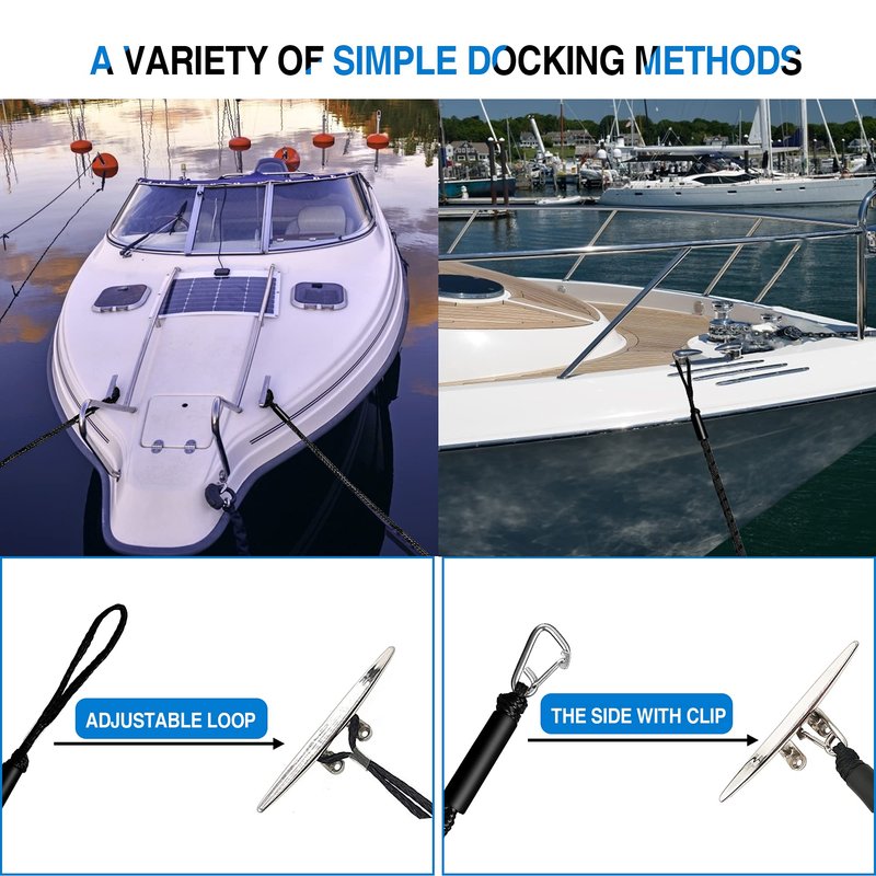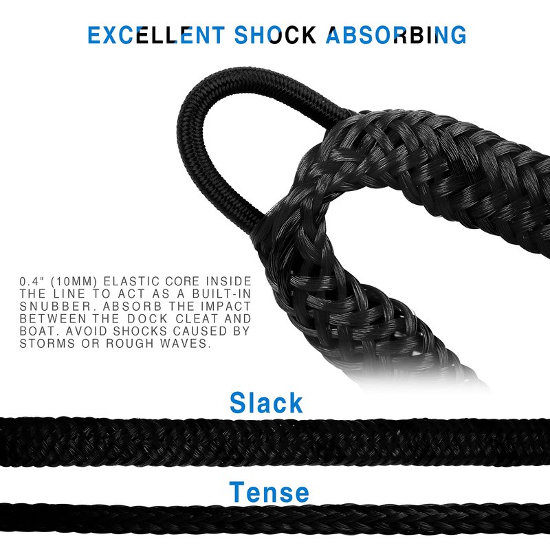 - Shock Absorbing: The bungee dock line is composed of a woven PE outer layer and a built-in hidden latex tube. Foam floats protect the boat from chafing. Boat bungee absorbs shock to boats and docks.