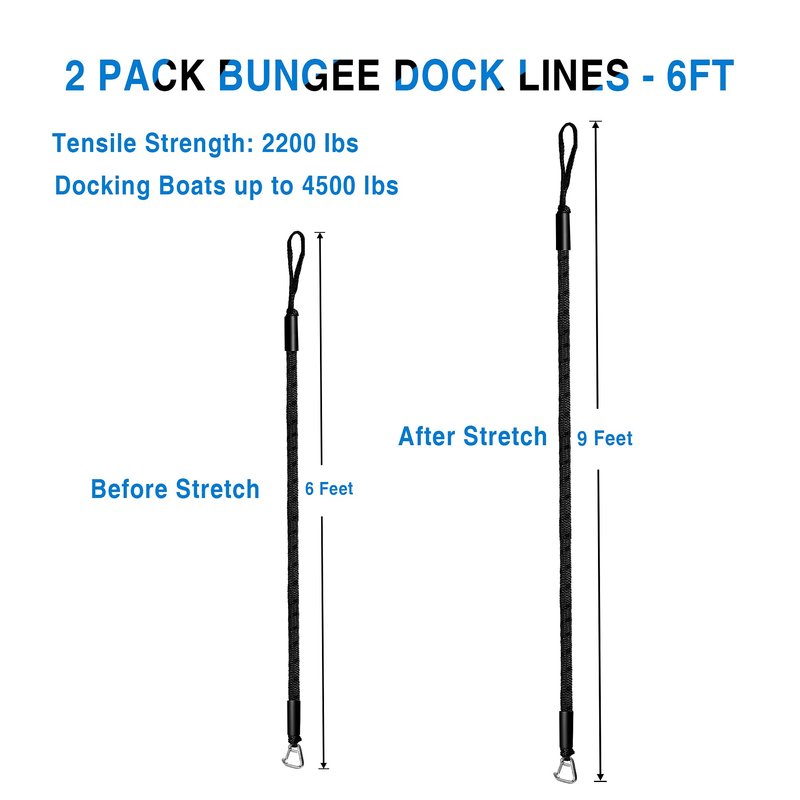 - Heavy Duty: Boat dock lines & rope 6’ ( stretch to 9’ ). The perfect length keeps the boat in good condition. Bungee dock lines for boats and PWC up to 4,500 lbs, tensile strength 2200 lbs.
