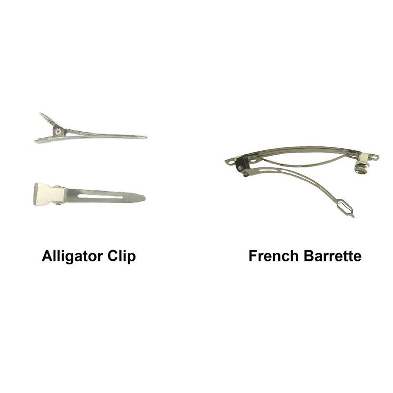 This bow is approximately 3.5" - 4" wide. It can be mounted on a small french barrette OR a partially lined alligator clip. Side: Please indicate if the bow will be worn on the right or the left side of the child's head. Why? The bunny will be upside down if you put your child's hair back to one side and you order the wrong side. If you are simply wearing the bow above a ponytail, then the side doesn't matter. If you pull her hair back to HER right, then you need a right bow, etc. All my bows are heat sealed for NO FRAYING! All items come from a smoke-free home.
