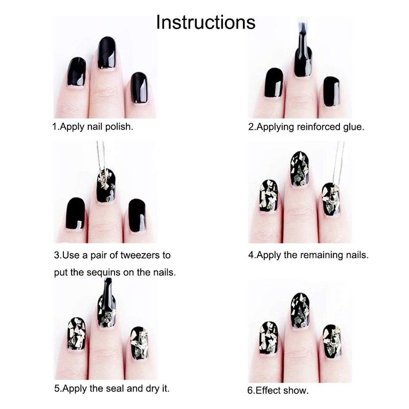 HOW TO USE: 1. Prepare your nails with uv base coat and cure it under uv/led lamp. 2. Apply uv color gel(Do not cure). 3. Apply nail sequins onto your nails. 4. Cure it under uv/led lamp. 5. Seal it with uv top coat and cure it under uv/led lamp.