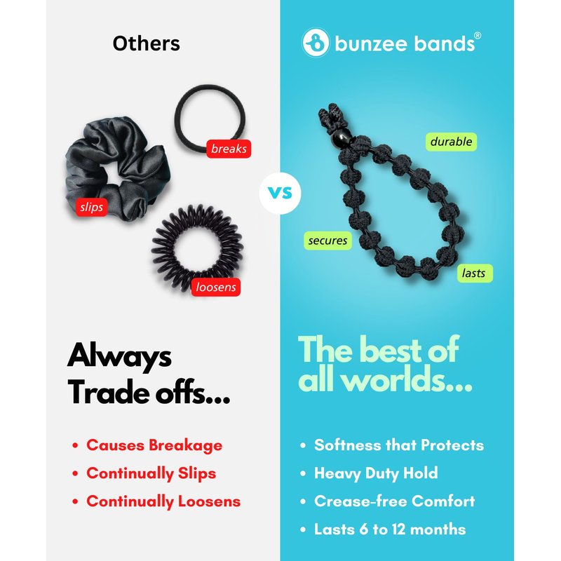 Hair ties that stay comfortably in place ALL DAY! As opposed to traditional hair ties that constrict and yank hair, Bunzees continuously conform and adapt to your every movement allowing them to stay in place longer and stronger. Our springy elastics, combined with resilient compressed cushions, provide all-day comfort and support.