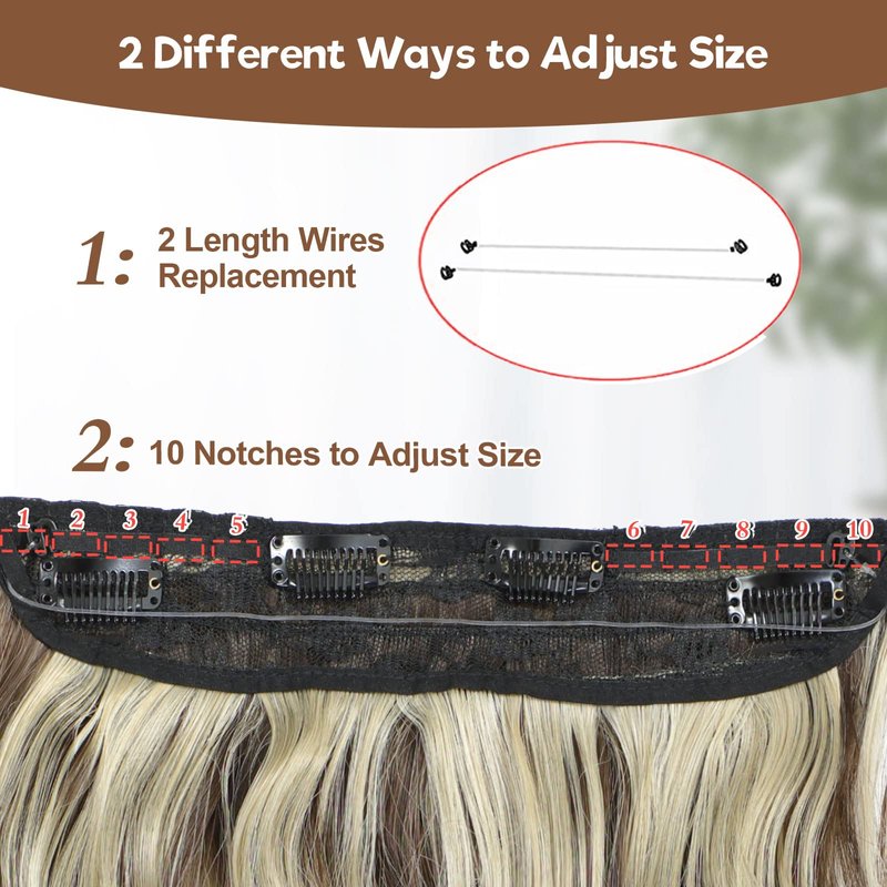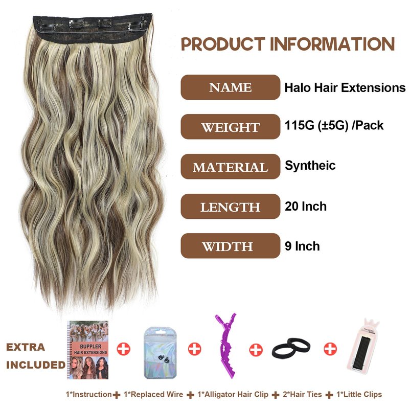- Specification:Each halo hair extension pack includes:1 pc with 4 clip in wefts,2 replacement wires of varying lengths,10 adjustable notches for a perfect fit,4 BB clips for extra security, and a thicker,more elastic,and wire to reduce scalp pressure