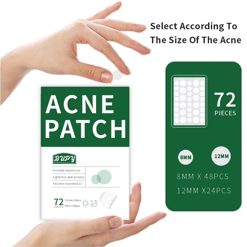 < b >Why chosing BUPY pimple patch?< /b >< br >All natural ingredients: Hydrocolloid zit patch with tea tree oil, safe and more effective.< br >Variety of sizes: S, L (8mm, 12mm) for your beautiful skin, no trouble even have a big pimple.< br >Blends in with all skin tones: No worry about BUPY pimple patches can't cover and hide your affected areas. It could be easily hidden with light make-up if necessary and does not leave any traces on your skin when it is removed.< br >< br >< b >Direction for Use and suggestions:< /b >< br >1. Wash and dry the pimples area firstly. For better effect, we recommend you to take tools to break up the acne at first.< /b >< br >2. Remove the film, take out the patch. Do not repeat to tear the patch for better adhesion.< /b >< br >3. Apply it on the pimples area, then gently press the area for 3-5 seconds to strengthen the fixed effect.< /b >< br >4. Remove and replace after it turns opaque. We recommend to wearing each patch for 5-8 hours, but no more than 12 hours.