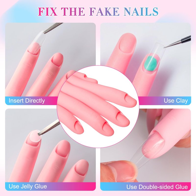 False nail tips can be insert into the nail practice hand tightly directly. You also can use clay, double-sided glue or jelly glue to fix the nail tips on fake hand.