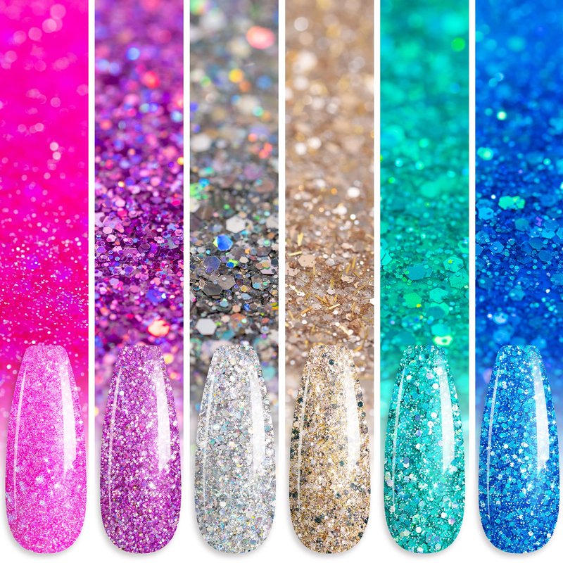 - Gorgeous Chrome Platinum Glitter Gel Polish Effect – 6 colors sparkly silver pink blue purple gel polish kit, suit for all nail art systems, can work with all UV LED soak off nail polish, easily to build out super diamond reflective gel effect.