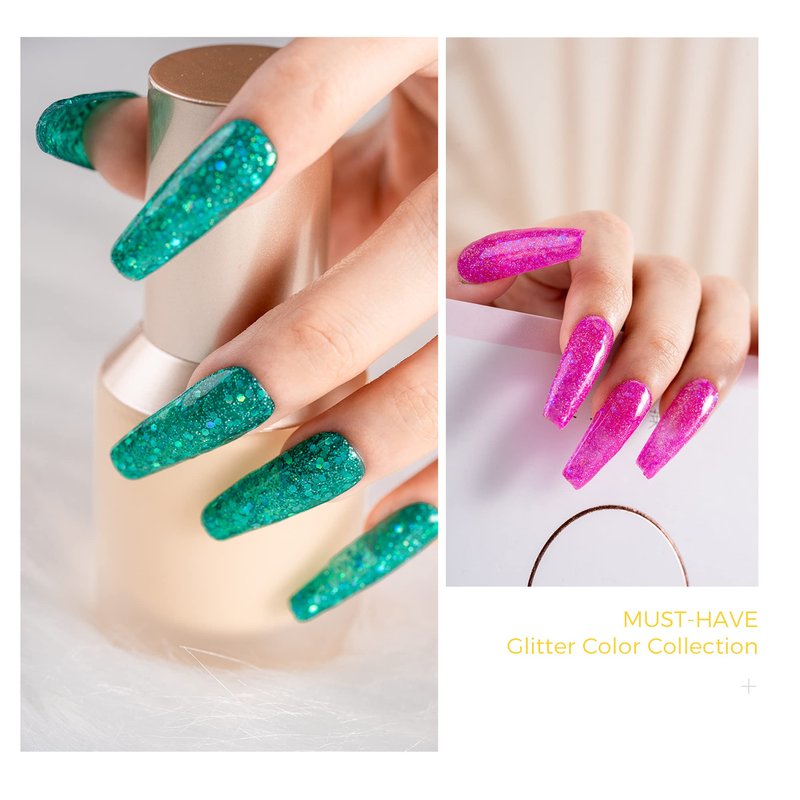 - Easy 3 Steps – First use the basecoat and cured by led lamp, apply the glitter gel nail polish and cure the led lamp, apply glitter gel nail polish and cured by led lamp again, apply topcoat and cured by led lamp , DONE!