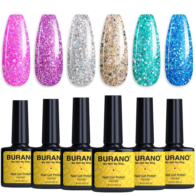 BURANO Chrome Glitter Gel Nail Polish Set - Sparkly Diamond Platinum Glitter Gel Nail Polish, Silver Pink Purple Blue Gel Polish Kit UV LED Soak Off DIY Gel G8-13