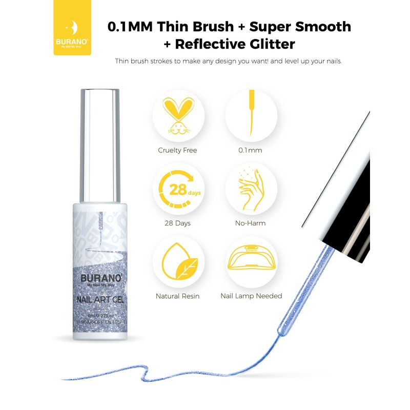- 💙【Long Lasting for 21+ Days】BURANO Nail Art Liner Gel Nail Polish can last 21+ days, suitable for any nail system. No lifting, no damage metallic gel nail polish, silver gel art liners for nails.