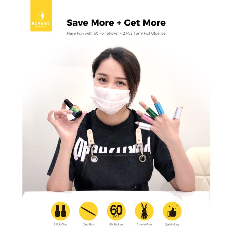 BURANO Nail Art Foil Glue Gel, 15ML 2 Bottles with 60PCS Foils Sticker, Nails Designer Adhesive Transfer Art UV LED Lamp Required