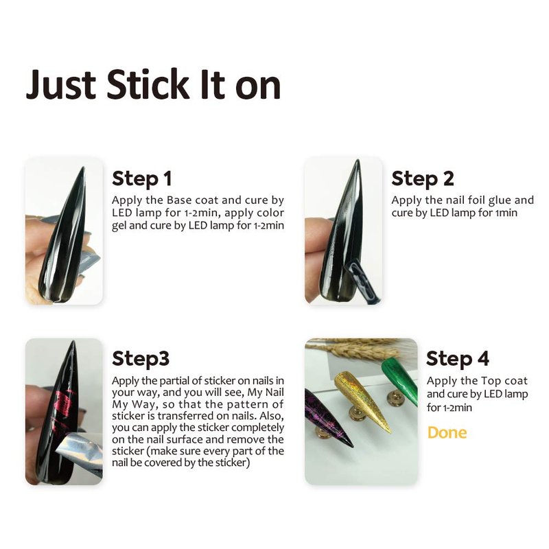 - What You Get: 60 PCS Different Stickers(4cm*20cm), 2 Bottles 15ml nail foil glue gel, Nail push brush pen, with pretty box! Welcome guide, our worry-free 12-month warranty, and friendly customer service.