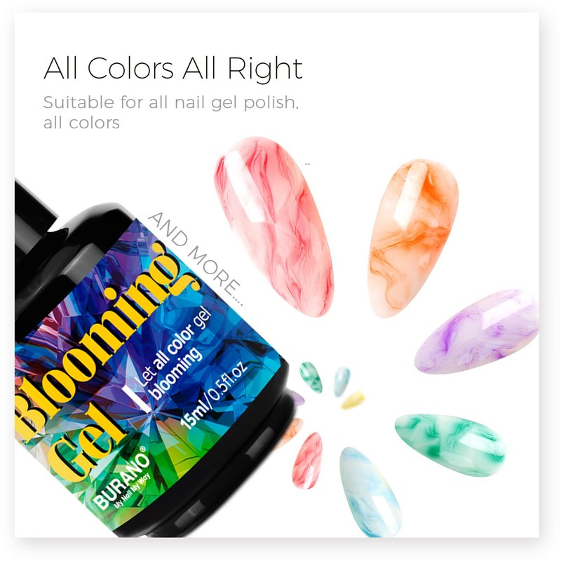 - Amazing Consistency Watercolor Nails Blooming Effects – BURANO Clear Blooming Gel, suit for all nail art systemS, u can pick the base colors and all the gel polish can bloom out gorgeous effect.