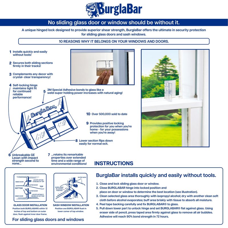 - Easy To Install: The Burglabar patio door lock is simple to install - no tools required - and its crystal-clear design easily blends in; This versatile child-proof door lock can be used as a sliding door security bar or a sliding window lock