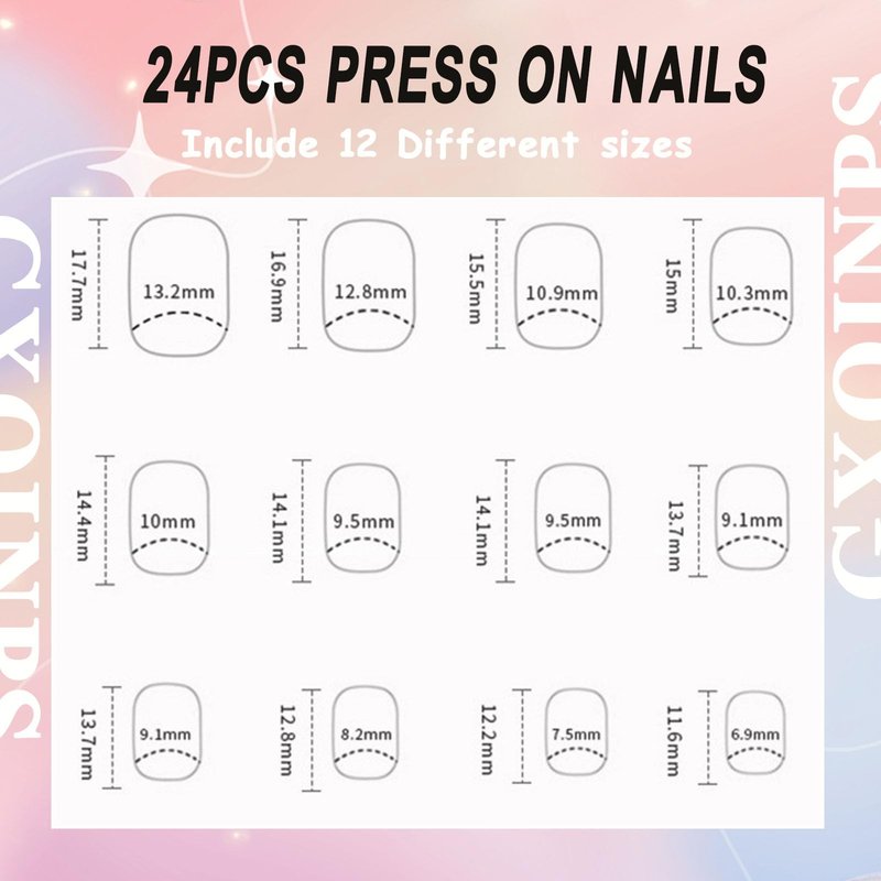 - 24Pcs artificial short square stick on nails, package with 1*Jelly Glue Stickers, 1*mini Nail File, 1*Wooden Stick. 12 Sizes for different fingers, a finger size that is perfect for most people. You can choose the most suitable fake nails for yourself, it is easy to trim and file them to in any length and shape you like.