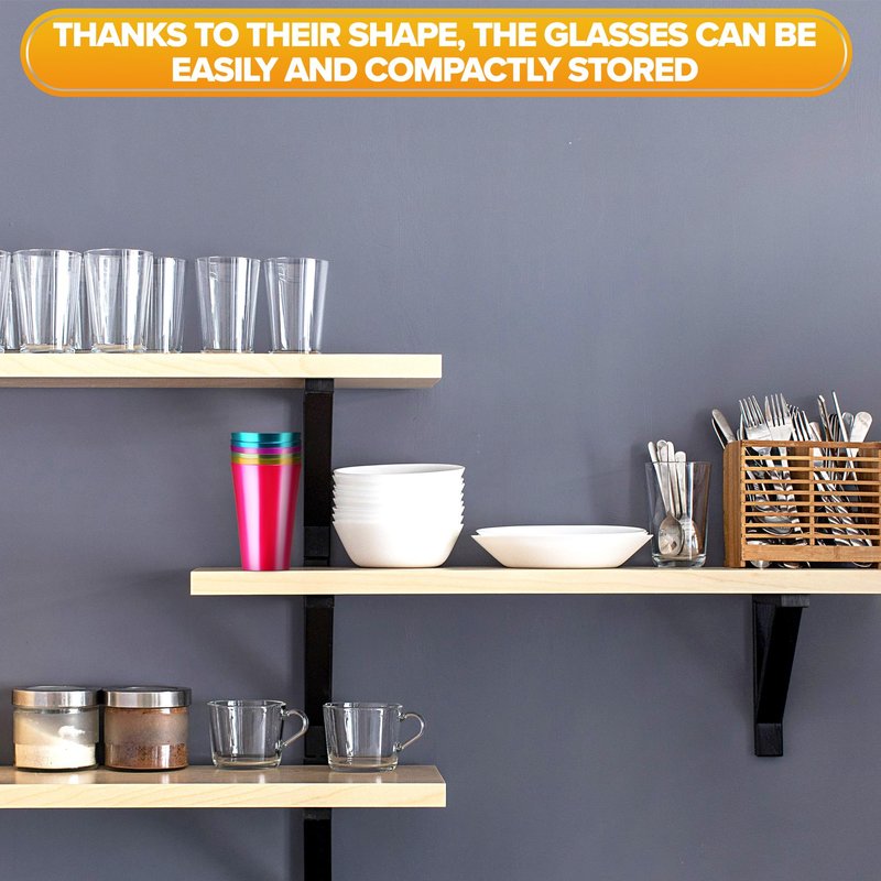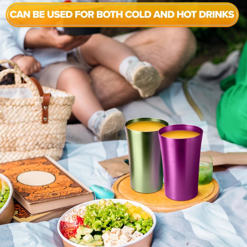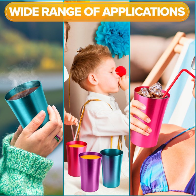 - Convenient Size of Metal Drinking Glasses: Each cup of 6 different colored aluminum colorful drinking glasses measures 5 inch tall and 3 inches in diameter. The capacity of our camping cups metal tumbler is 16 Oz. The shape of our kids reusable cups is tapered, so fits most car cup holders.