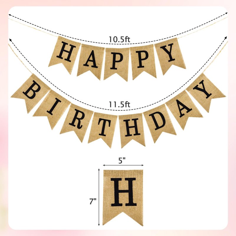- Pre-Assembled & Adjustable Birthday Banner: Includes 2 pre-strung jute twine strings (10.5 ft "HAPPY" and 11.5 ft "BIRTHDAY")—no assembly required! Easily hang and adjust spacing between 13 flags (5.1×7.1in each) to fit any space.